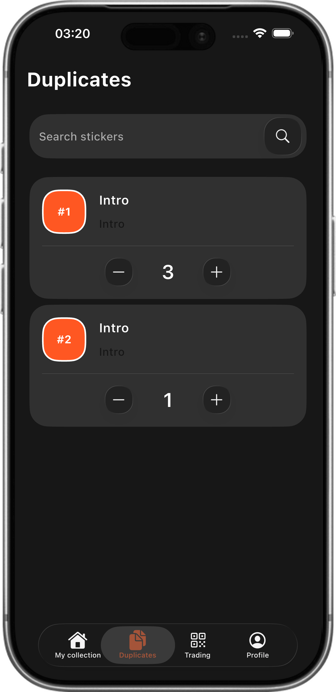 Digital companion app for sports sticker collectors that tracks your collection, manages duplicates, and finds perfect trading partners.