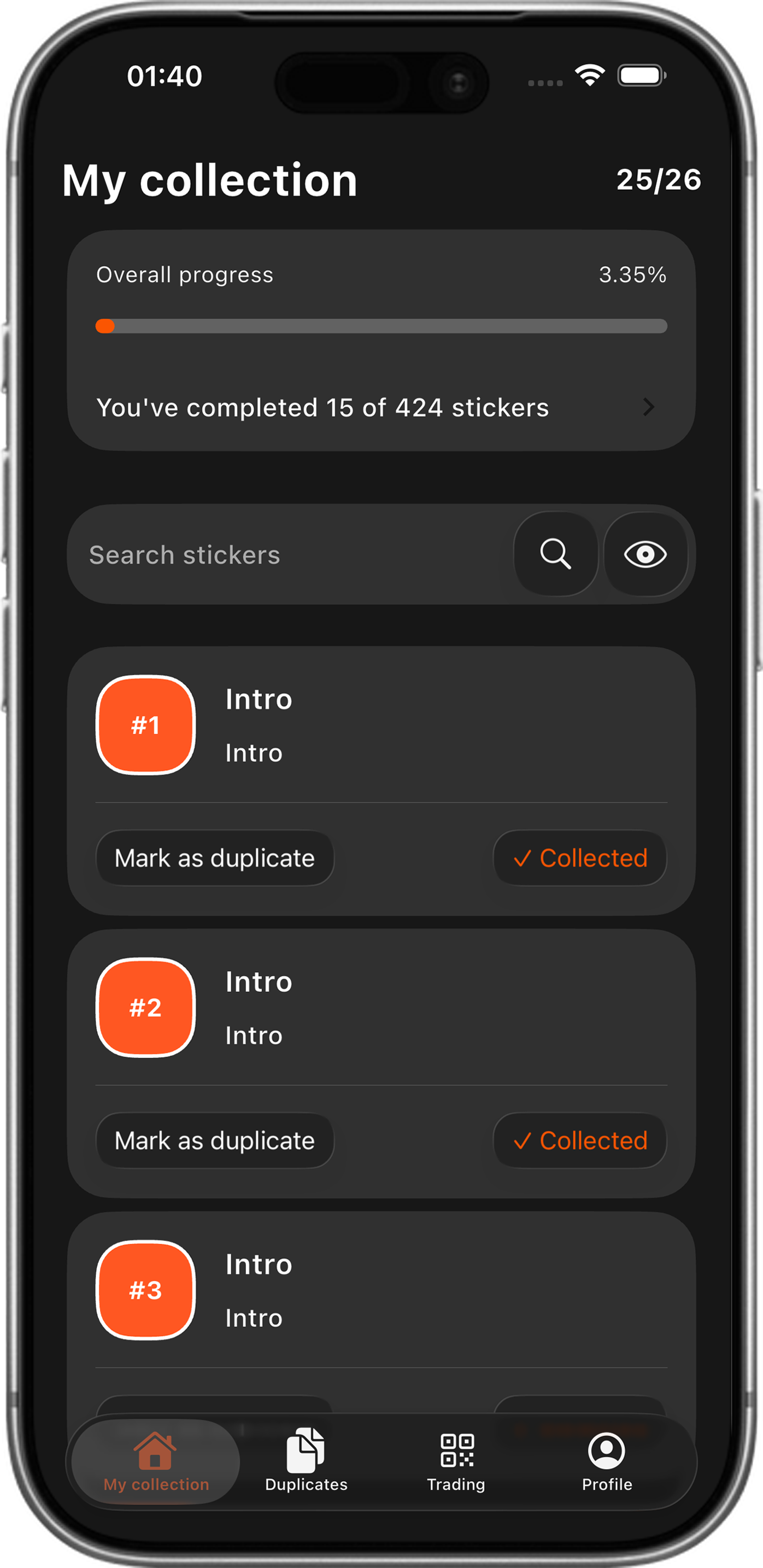 Mark stickers as collected with a tap. Track your progress with visual indicators, completion percentages, and duplicate management.